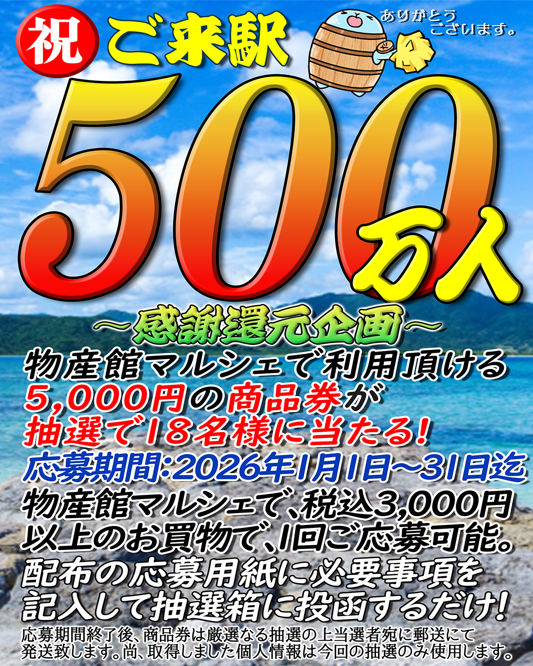 01Jan2026 500万人 感謝還元企画 今年もよろしくお願いいたします。 本日より、今月一杯までマルシェで、税込3000円以上レシートのお買物で応募可能となります 注意 マルシェ内のお買物限定になります。 他のテナントでのお買物は応募の対象外となります。 5000円の商品券が抽選で18名様に当たります ご不明な所が事務所に足をお運びくださいませ。 合算レシートでも可能となります。 応募期間:2026年1月1日~1月31日迄 Tweet Share 本年もどうぞよろしくお願い致します 最近のお知らせ一覧お知らせ一覧 本年もどうぞよろしくお願い致します 2026.01.01 今年一年、誠にありがとうございました。 2025.12.31 ★年末年始期間の営業時間のお知らせ★ 2025.12.24 PAYどん取扱店舗で使えるお得な✨プレミアムポイントが期間限定ではじまります🎉 2025.11.07 11月22・23・24日は「たるたるぱあく開駅7周年記念感謝祭」開催!! 2025.09.11