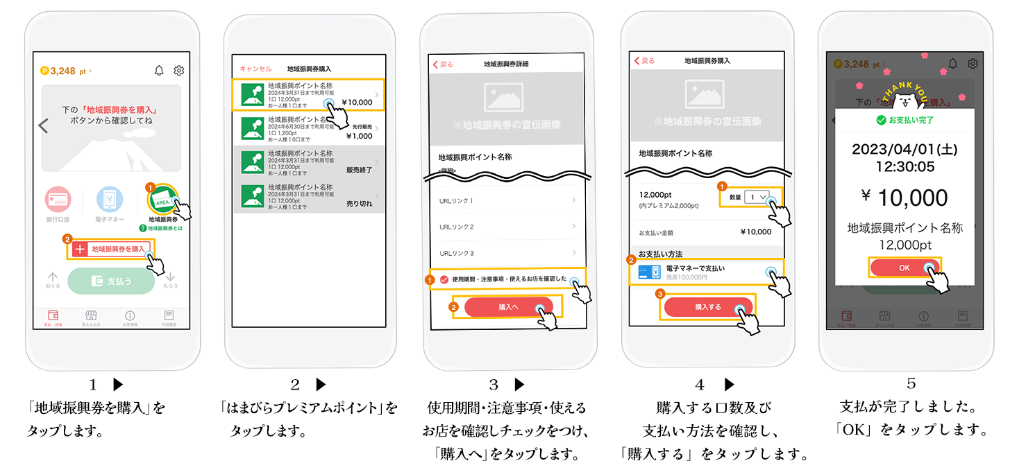 ※「payどん」の利用が初めての方はプレミアムポイント購入の前にアカウントの作成、金融機関口座をアプリに登録する必要があります。